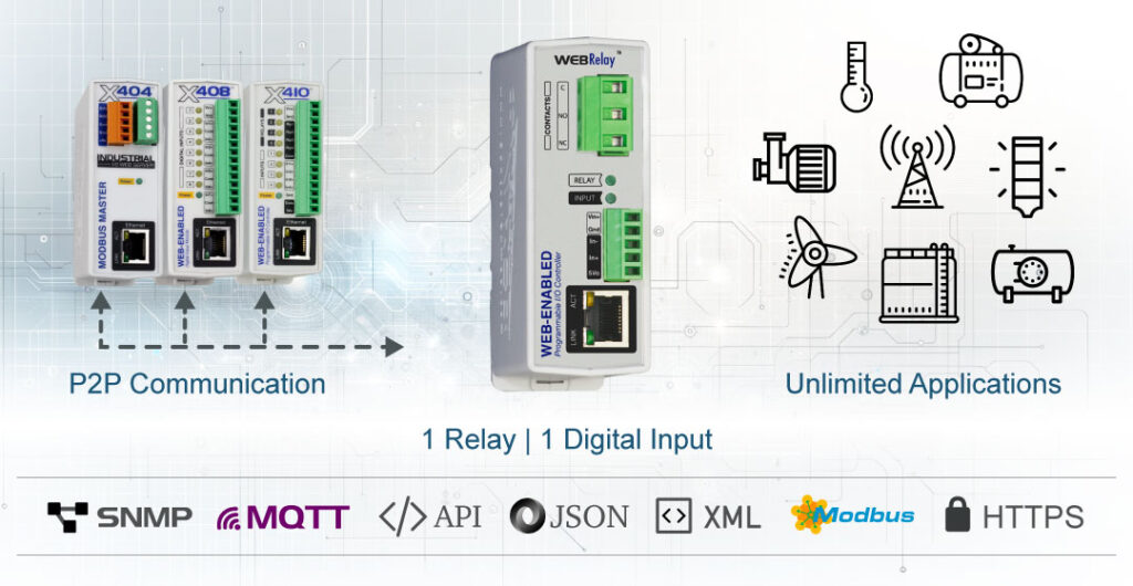 The WebRelay serves as the standard for controlling and monitoring devices from the comfort of your web browser. This simple network-controlled edge controller is powerful and flexible—ideal in applications like pump and motor control, security lock systems, remote reboot, and lighting control.