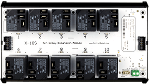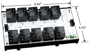 The X-18S™ expansion module is used with an X-400™ or X-600M™ controller. It has ten high-current relays (15Amp), each with Form-C contacts (SPDT). Wiring connections are made directly to the relays using 1/4″ tab terminals.