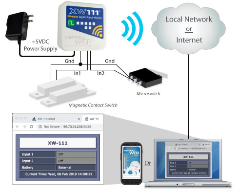The XW-111™ is an easy-to-use, wireless digital input monitoring device with a built-in web server. It can sense the state of up to two switch-state closure sensors.