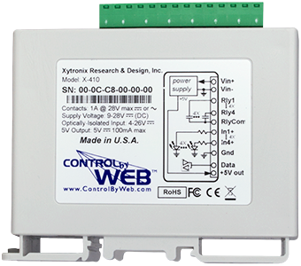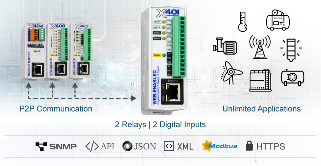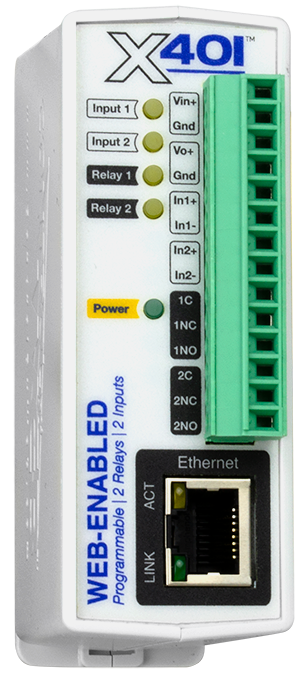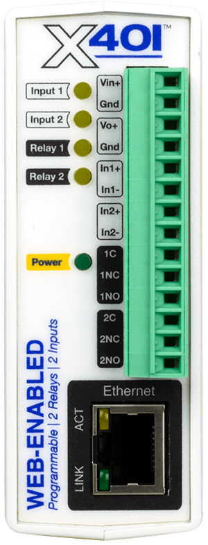 The X-401 is an easy to operate and very capable Ethernet I/O PLC that’s a great fit for large and small IIoT applications. It can monitor up to 2 contacts and control up to 2 relays. Configure and access your device through a standard web browser—no special software required.