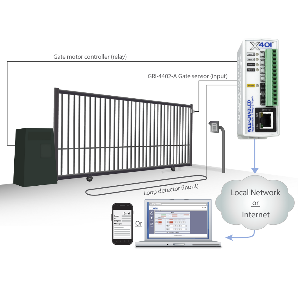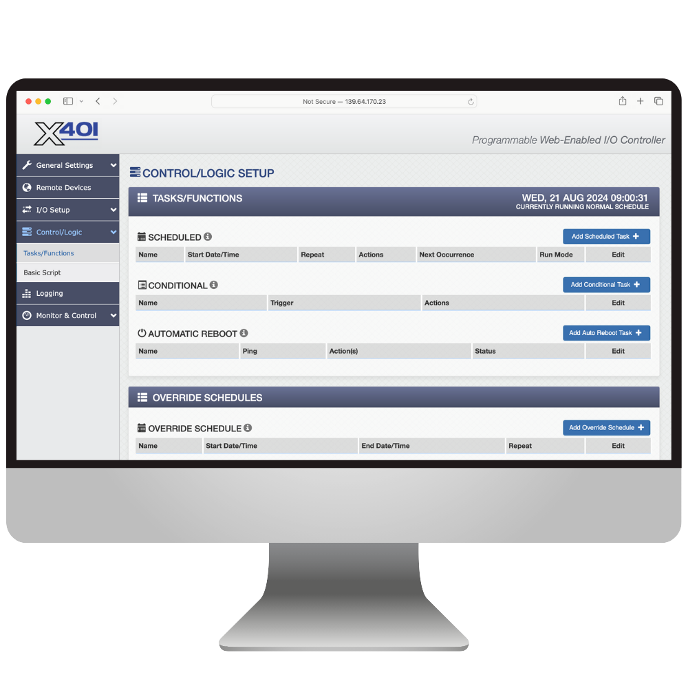 When a hardwired Ethernet connection isn’t practical, WiFi connectivity allows you to easily monitor and control your I/O module wirelessly. The built-in WiFi capability of the X-401W allows you to create logic, monitor inputs, and trigger relays through a standard web browser and WiFi network. (Note that an Ethernet connection is required for initial setup of 400 Series devices.)